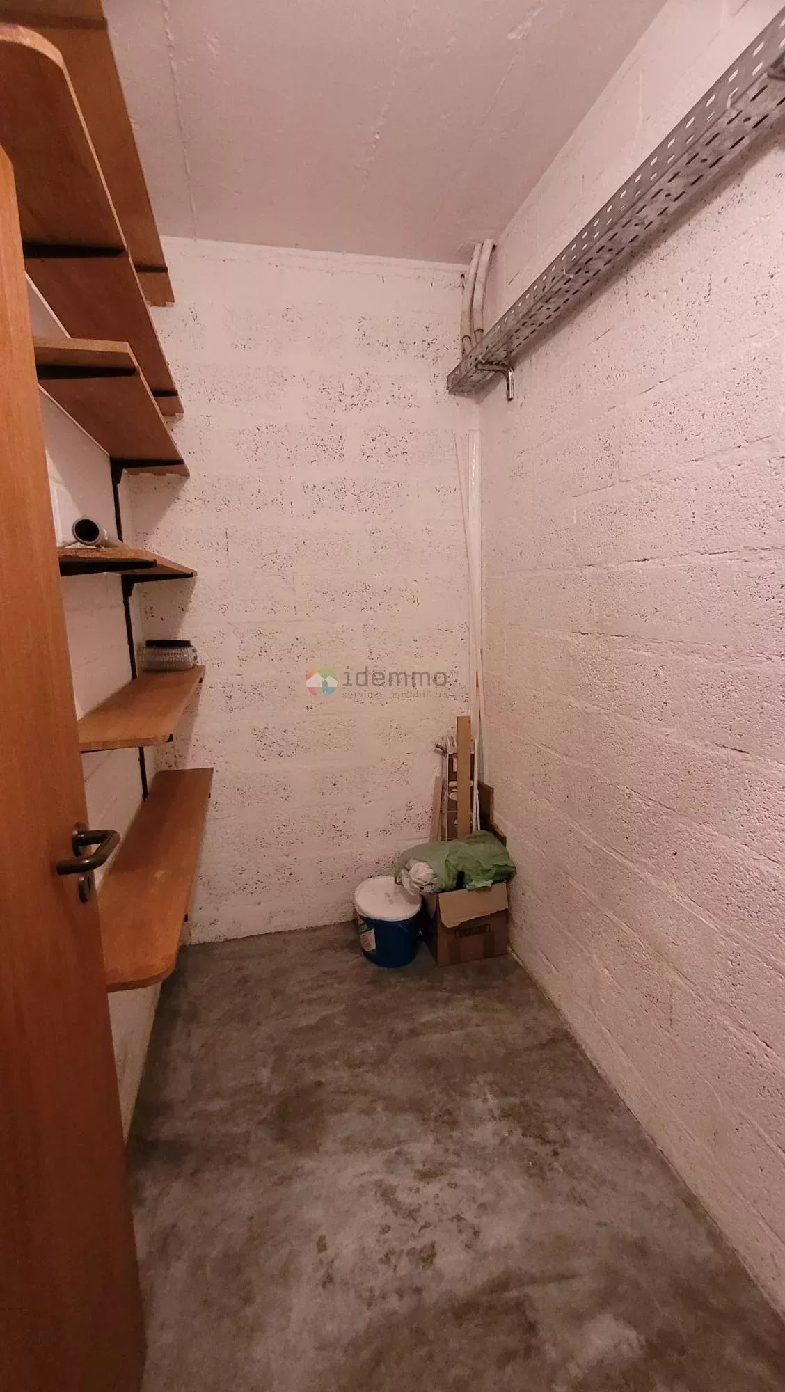 Le hall d'entrée donnant sur la grande pièce de vie avec un accès à la grande terrasse (14,50 m²) avec une vue panoramique sur les champs et une partie de la ville, la cuisine équipée séparée avec un accès à la même terrasse, la salle de bain et la chambre à coucher de 14m².À cela, s'ajoute un garage-box à l'arrière de la résidence, une cave privative et une buanderie commune au sous-sol.